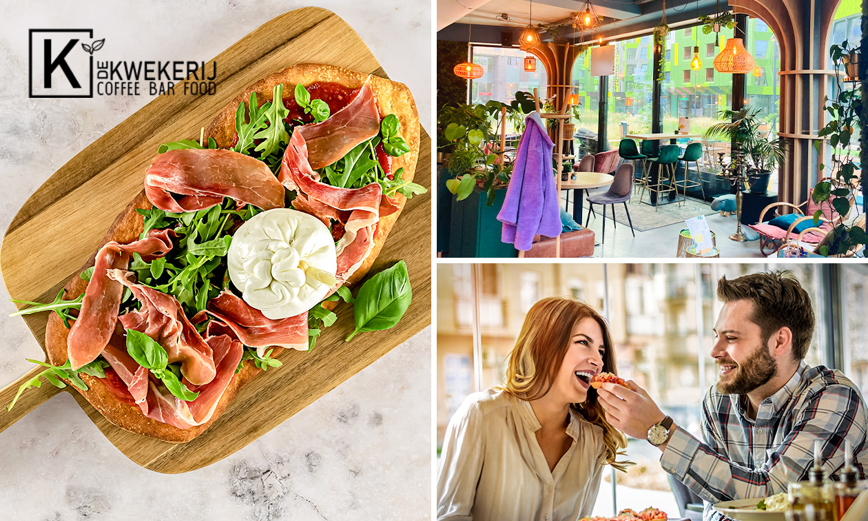 Geniet van een heerlijke 2-gangen keuzelunch bij De Kwekerij: kies uit verrukkelijke gerechten zoals de Turkish eggs, oesterzwam kroketten of flammkuchen zalm