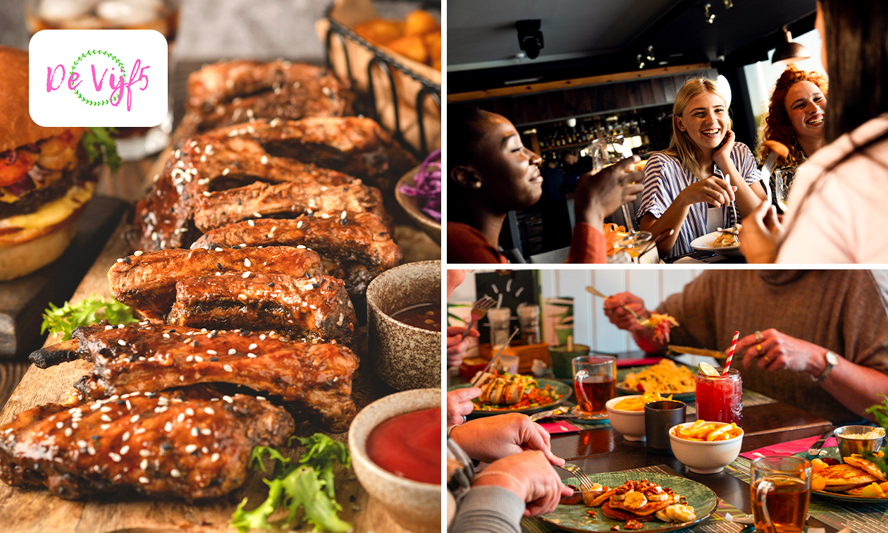 Heerlijk 2-gangendiner met lichtpittige spareribs, friet, salade en een saus naar keuze bij Café Restaurant De Vijf: inclusief churros of gebak van de dag na