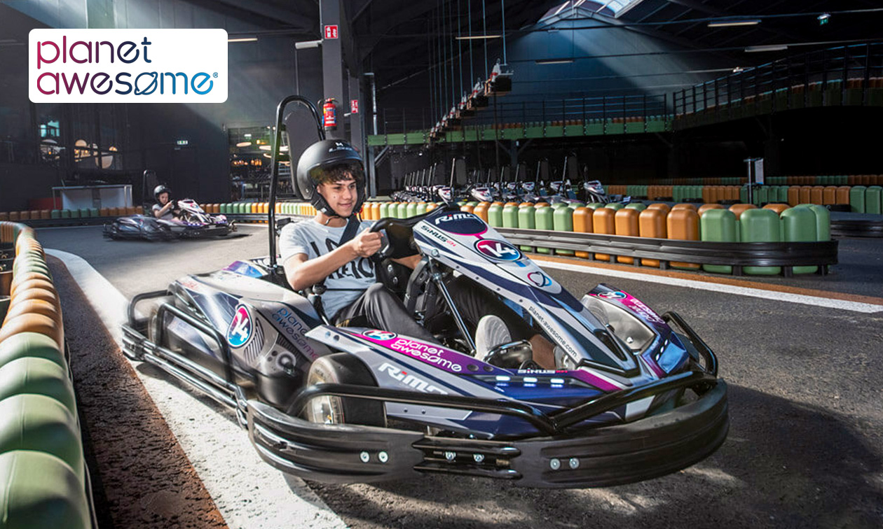 Karten voor 2 of 3 heats van ieder 10 minuten op de indoor kartbaan van Planet Awesome Nijmegen: cross over de baan met meerdere verdiepingen en voel de adrenaline door je lijf gieren