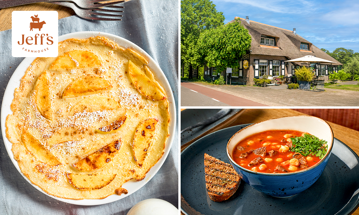 Geniet van een 3-gangen keuzelunch of -diner met als hoofdgerecht een smakelijke pannenkoek met 2 toppings naar keuze bij Jeff's Farmhouse