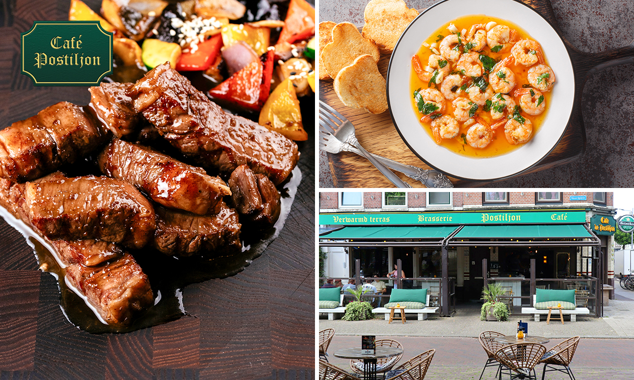 Heerlijk 3-gangendiner met vrije keuze van de kaart bij Café Postiljon in het hart van Rotterdam Noord: geniet bijvoorbeeld van gamba's, biefstukpuntjes en tiramisu