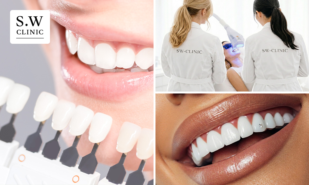 Een stralend wit gebit met 3 tandenbleekbehandelingen (20 minuten), eventueel inclusief polijsten bij S.W Clinic: of kies voor het laten zetten van een tanddiamant