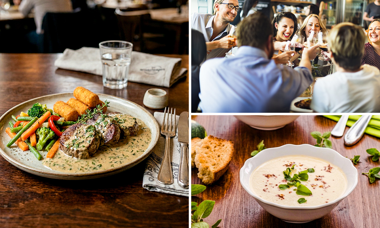 - Kies daarna bijvoorbeeld voor een leberknödelsuppe, sappige beenham in amandel-mierikswortelsaus en sluit af met vanille-ijs met warme frambozen