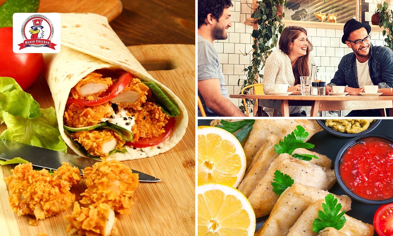 Geniet van een complete maaltijd met een burger of wrap naar keuze bij Maxin Chicken: inclusief samosa of chicken roll fries en een drankje naar keuze