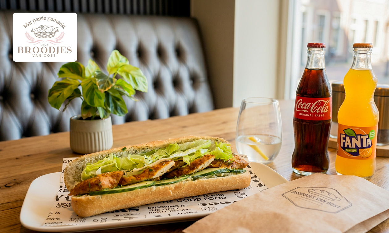 Geniet van een rijkelijk belegde pistolet en een drankje naar keuze voor afhaal bij Broodjes van Oost: ga bijvoorbeeld voor een broodje brie of broodje gezond en een cola of Fanta