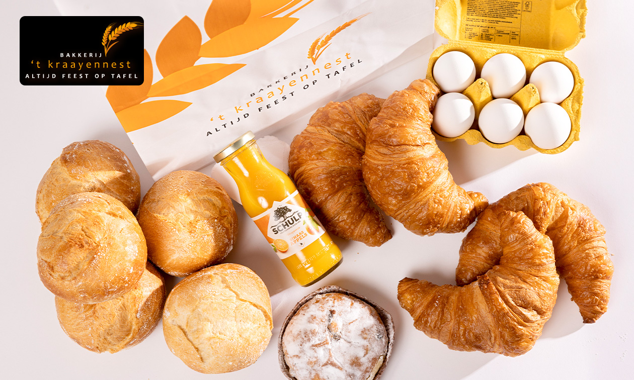 Begin je zondag goed met een heerlijk ontbijtpakket, af te halen bij één van de vestigingen van Bakkerij 't Kraayennest in Beuningen, Boxmeer, Heesch, Wijchen of Millingen: geniet van puur vakmanschap